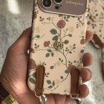 قاب موبایل آیفون گل فلاور کرم فندقی + بند چرمی ست