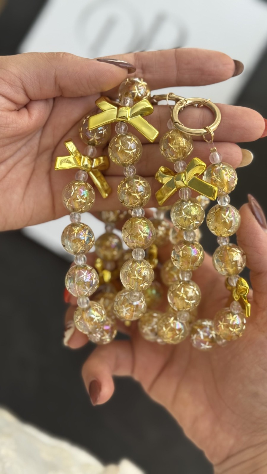 این آویز موبایل شامپاینی از متریال باکیفیت ساخته شده که دوام بالا و ماندگاری رنگ فوق‌العاده‌ای دارد. مهره‌های طلایی-شفاف آن دارای افکت براق و انعکاس نور هستند و در نور طبیعی جلوه‌ای درخشان‌تر پیدا می‌کنند. پاپیون‌های طلایی نیز جلوه‌ای لوکس و خاص به آن می‌بخشند.