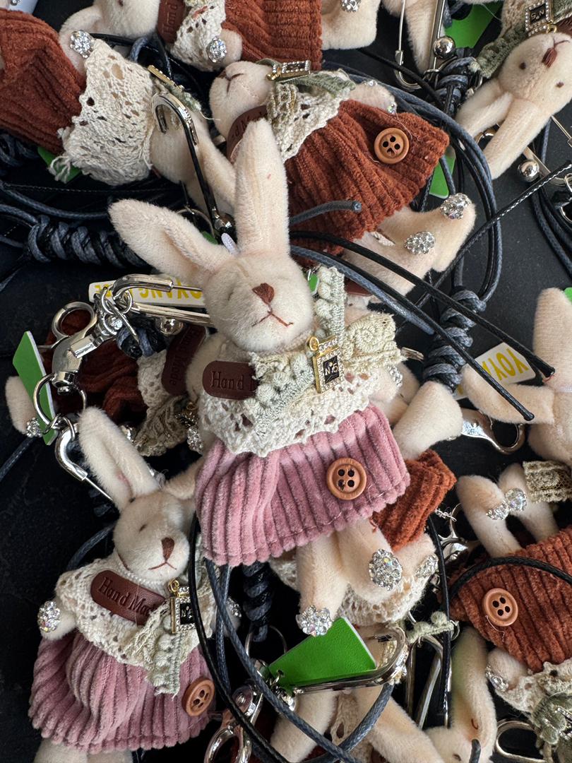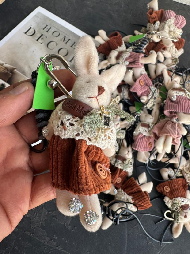 لباسهای بافتنی و رنگهای گرم استفادهشده در طراحی این بگ چارم خرگوش پاییزی، حس و حال پاییز را به خوبی منتقل میکند. ترکیب رنگ قهوهای، صورتی و جزئیات دستدوز، آن را به یک آویز متفاوت و دلنشین تبدیل کرده است.