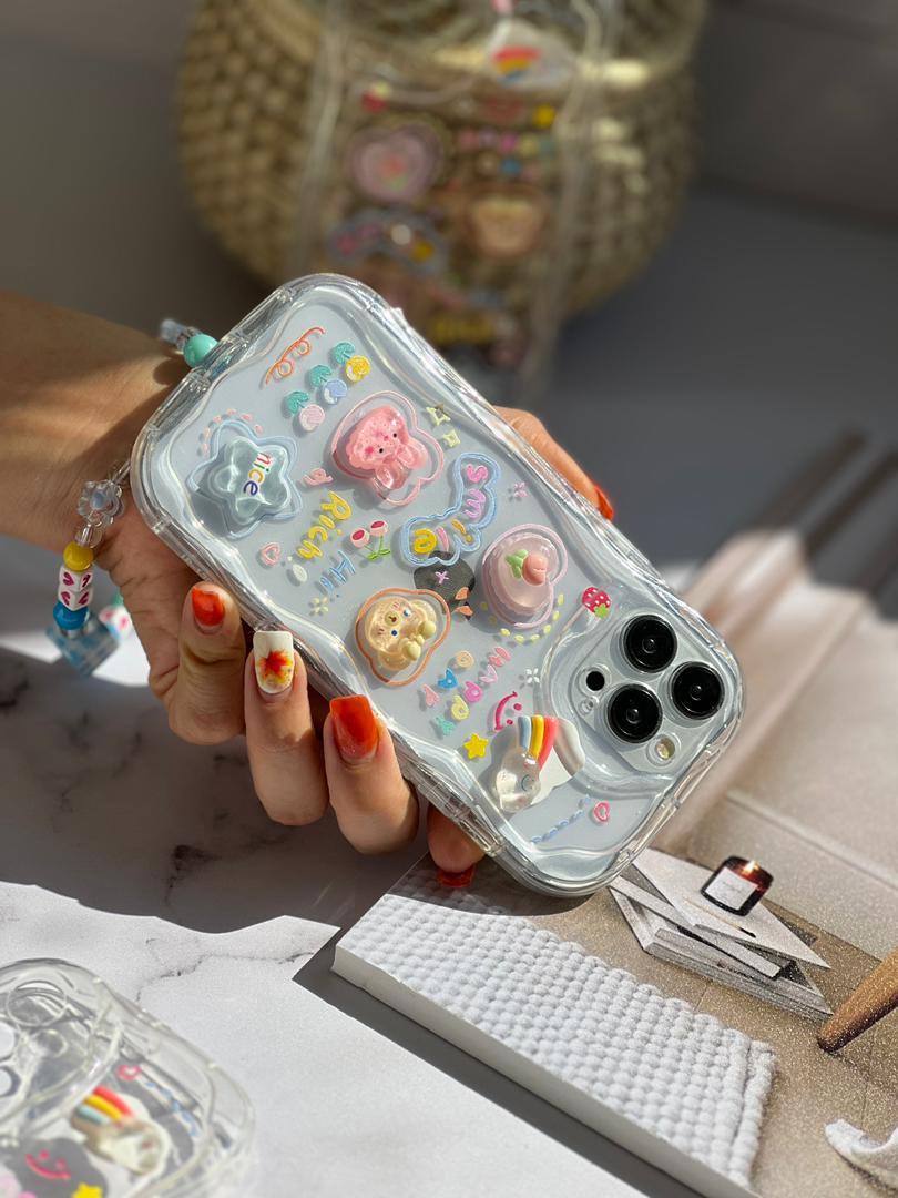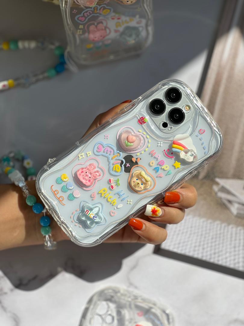 قاب موبایل آیفون اپوکسی بیرنگ روز شاد خرس و خرگوش برجسته + آویزست