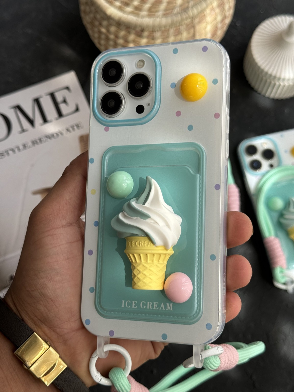 قاب موبایل آیفون بستنی قیفی دو رنگ جاکارتی بند ست
