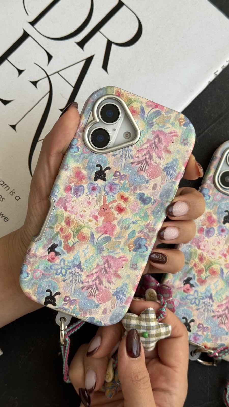 قاب موبایل آیفون خرگوش واندرلند + بندست گل پارچه‌ای یکی از خاص‌ترین و جذاب‌ترین انتخاب‌ها برای کسانی است که عاشق طرح‌های فانتزی، شخصیت‌های کارتونی و رنگ‌های ملایم هستند. این قاب با ترکیب تصویرهای رنگارنگ، گل‌ها، خرگوش‌های کوچک و جزئیات ظریف، ظاهری زیبا و منحصر‌به‌فرد ایجاد کرده که نگاه هر کسی را به خود جلب می‌کند. سبک واندرلند در این قاب باعث شده که حس جادو، لطافت و خیال‌پردازی به گوشی شما اضافه شود.