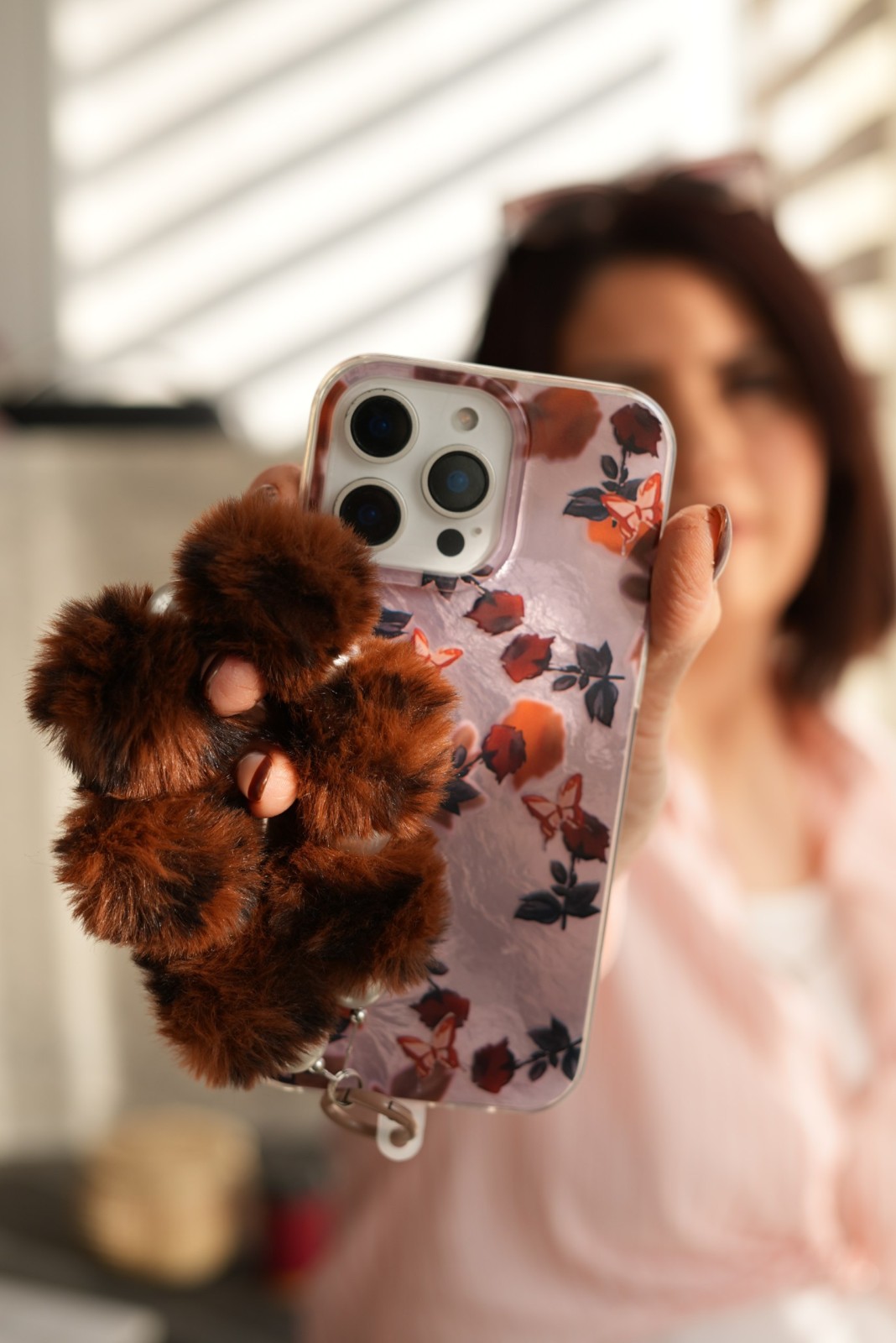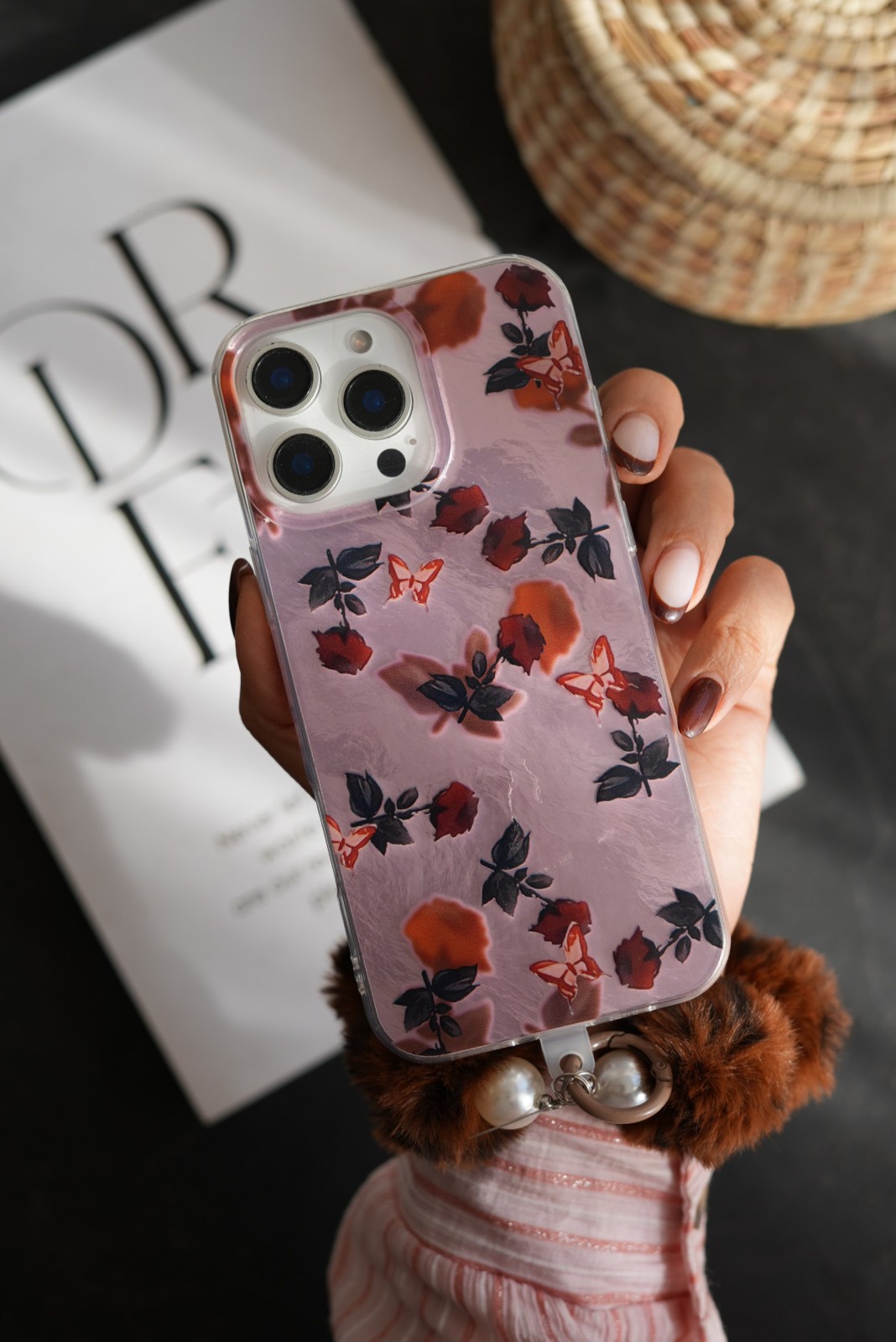 قاب موبایل آیفون دم روباهی پروانه گل سرخ + بندست پشمی