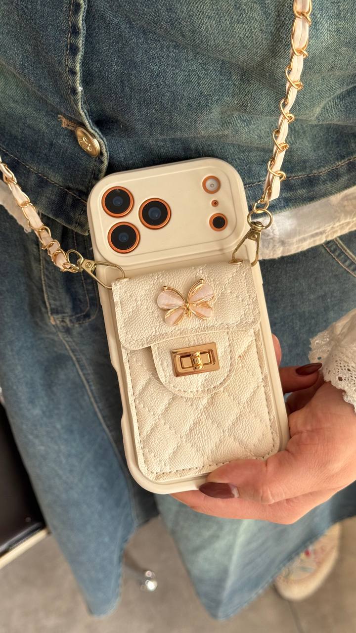 قاب موبایل ( آیفون – سامسونگ ) بند زنجیری بلند بالشتی پروانه ای جاکارتی دار