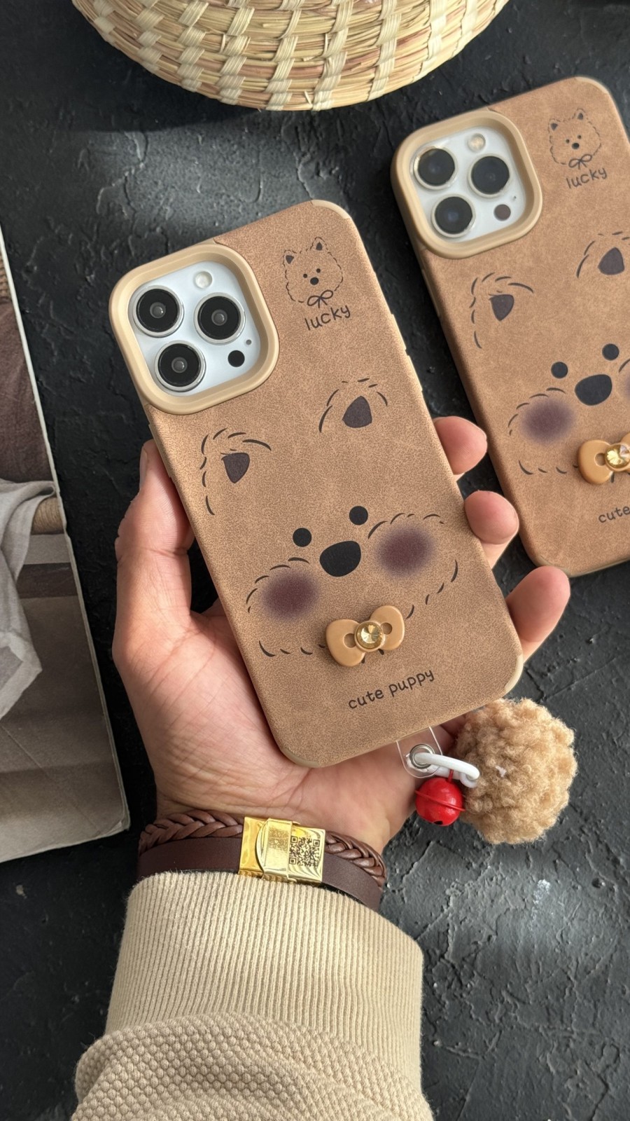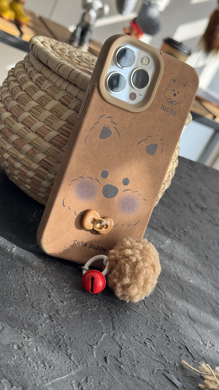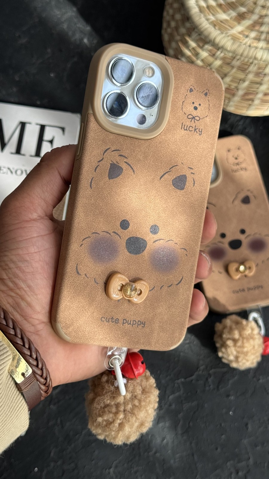 قاب موبایل( آیفون ) سگ بیگ فیس پاپی پاپیون برجسته + زنگوله پشمالو