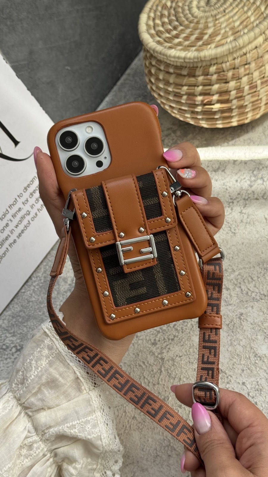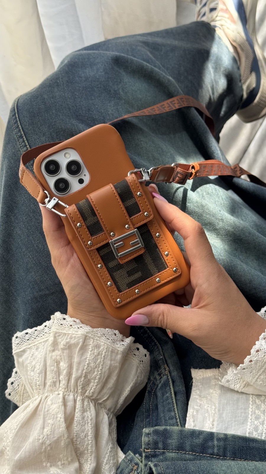 قاب موبایل آیفون فندی چرمی قفل فلزی جاکارتی + بندست بلند