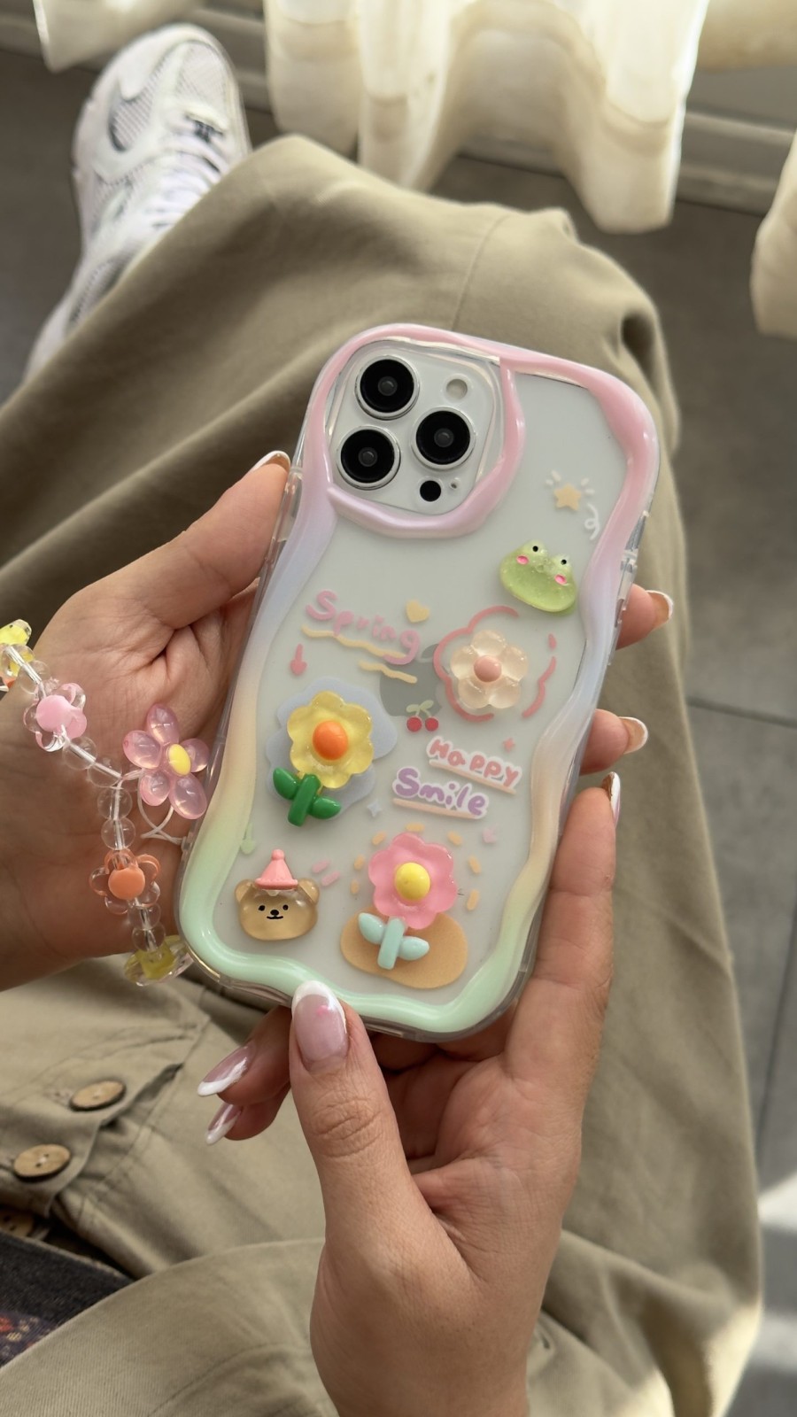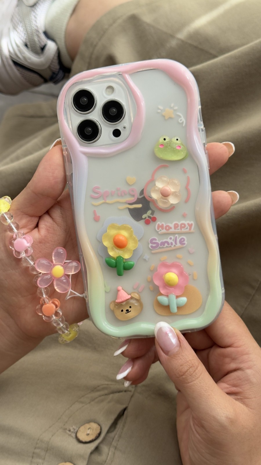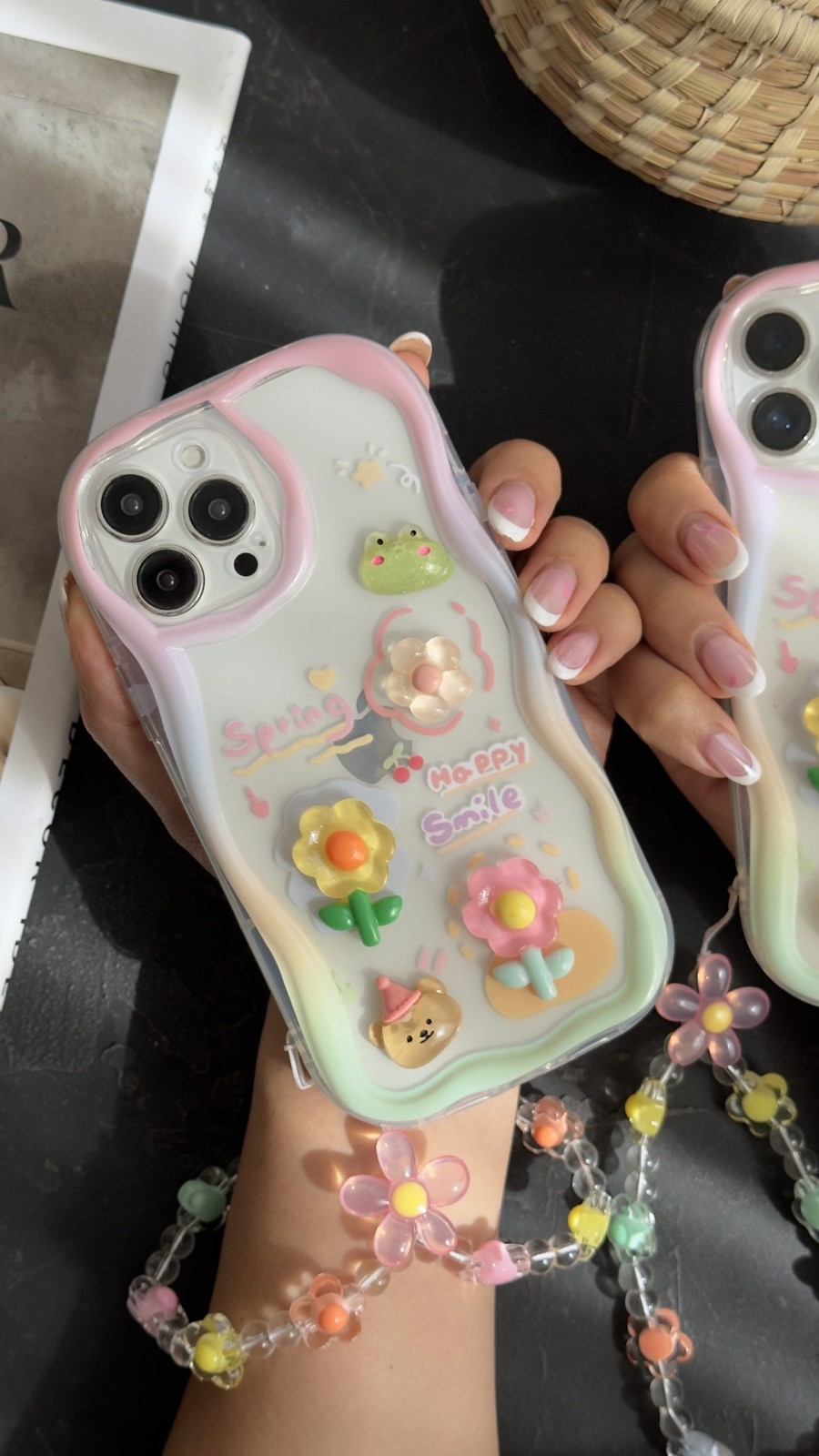 یکی از ویژگی‌های منحصربه‌فرد این محصول، بندست بابونه است که هم به عنوان یک زنجیر دستی زیبا و هم وسیله‌ای کاربردی برای حمل راحت‌تر گوشی مورد استفاده قرار می‌گیرد. این بندست از مهره‌های رنگی و گل‌های شفاف ساخته شده که هارمونی جذابی با قاب ایجاد می‌کند.