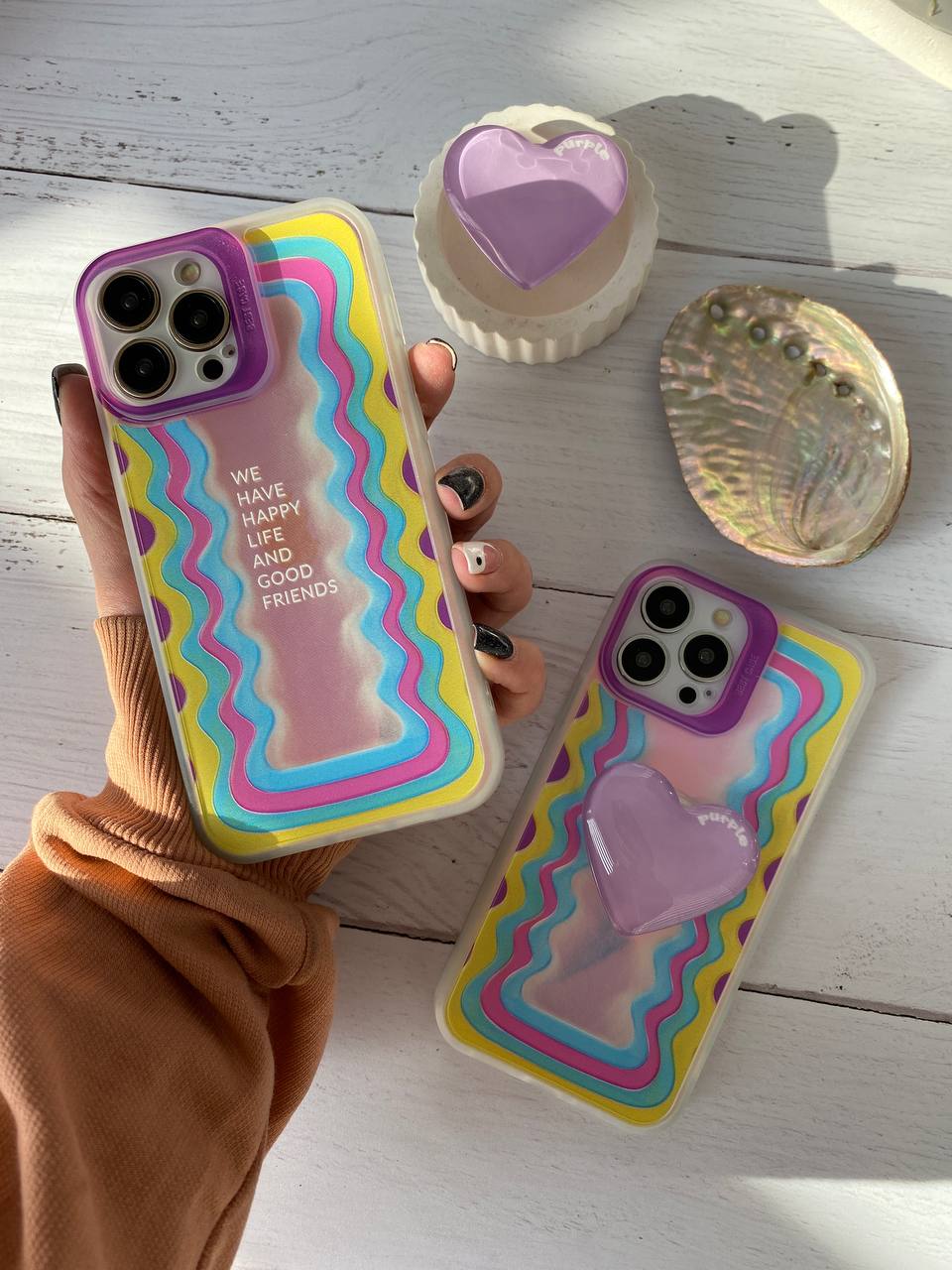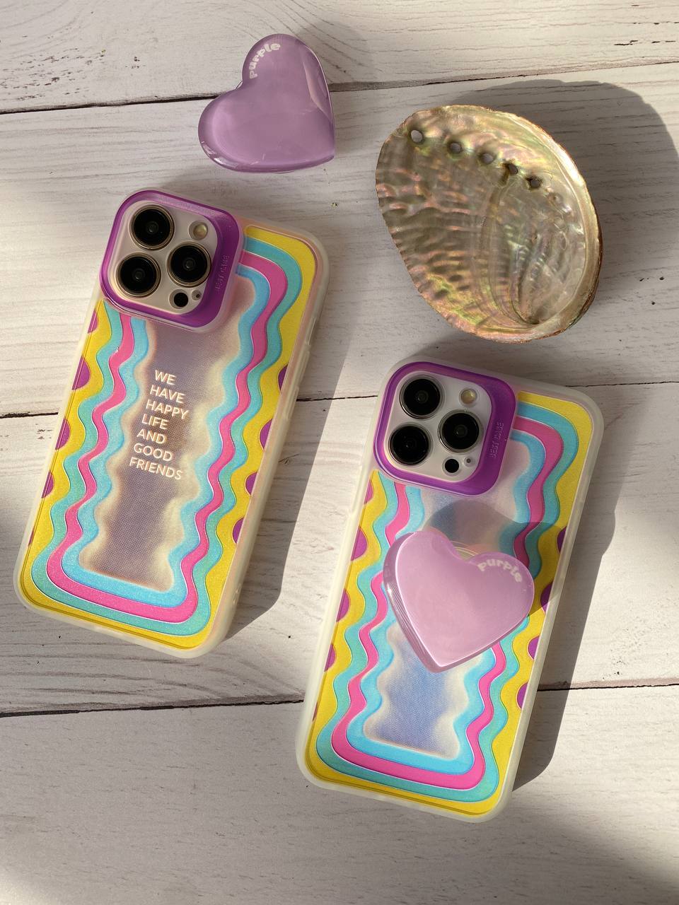 قاب موبایل آیفون هپی لایف هفت رنگ + پاپسوکت قلبی بنفش