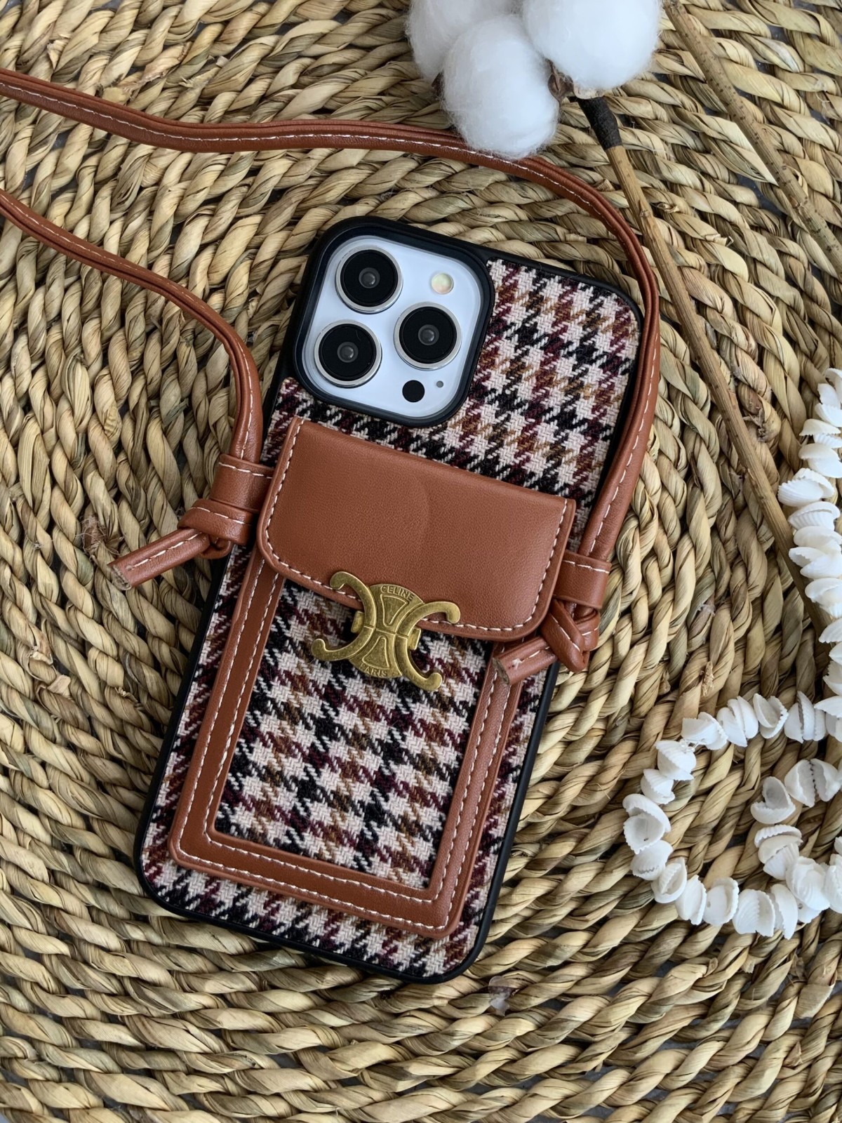 قاب موبایل آیفون پارچه ای و فلزی طرح باربری جاکارتی + بندست