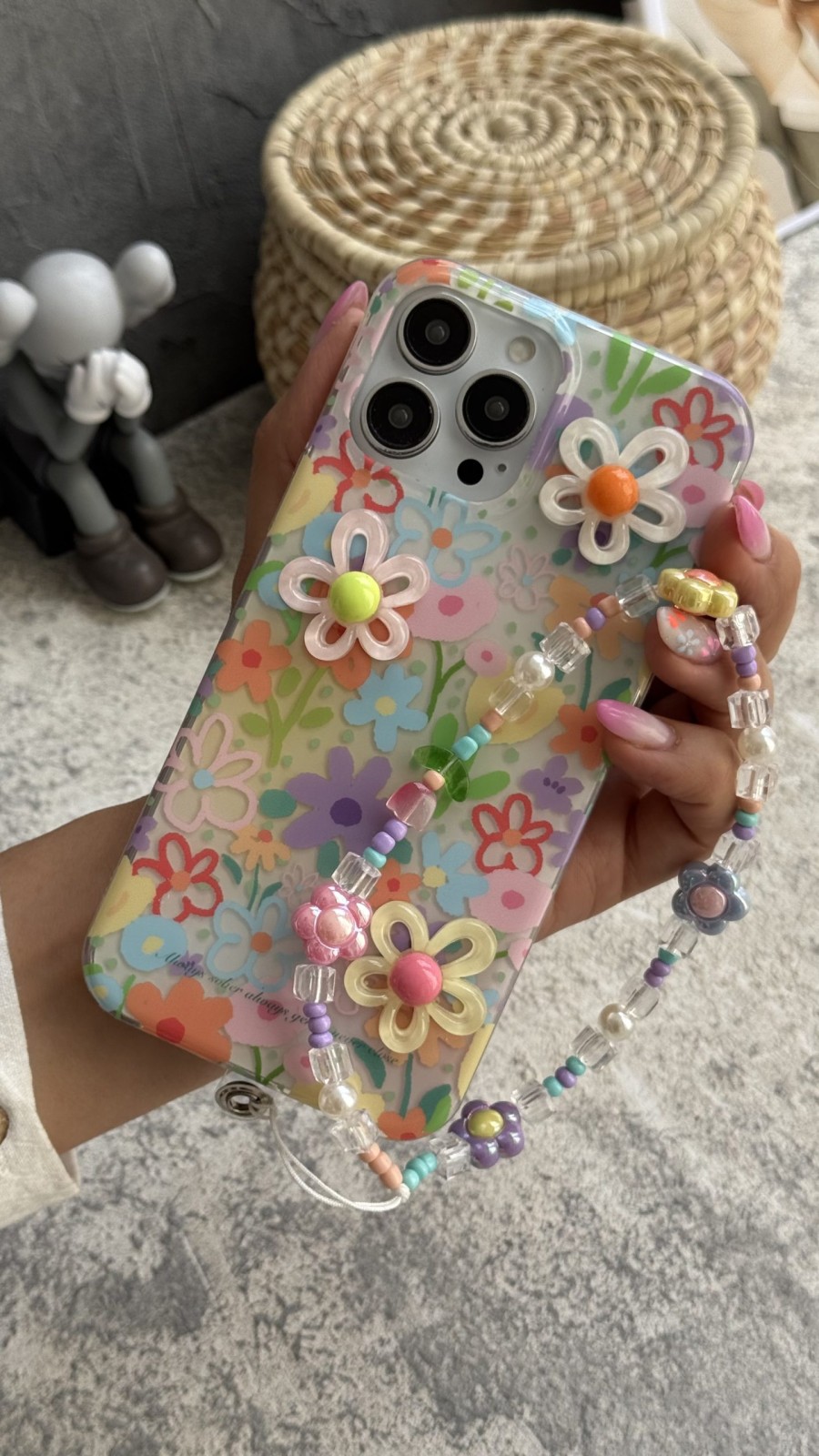روی این قاب از گل‌های بابونه برجسته استفاده شده که علاوه بر زیبایی، حسی سه‌بعدی و خاص به آن می‌بخشد. رنگ‌های متنوع و زنده باعث می‌شوند کاور با هر نوع استایل و سلیقه‌ای هماهنگ باشد. به همراه این قاب یک بندست مهره‌ای رنگی و دست‌ساز نیز ارائه می‌شود که هم جنبه‌ی تزیینی دارد و هم استفاده‌ی کاربردی؛ شما می‌توانید گوشی خود را راحت‌تر حمل کنید و استایلی دخترانه و دلنشین داشته باشید.