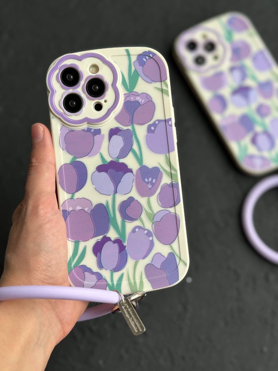 قاب موبایل آیفون گل لاله بنفش محافظ لنز طرح دار + حلقه ست ( 3011 )