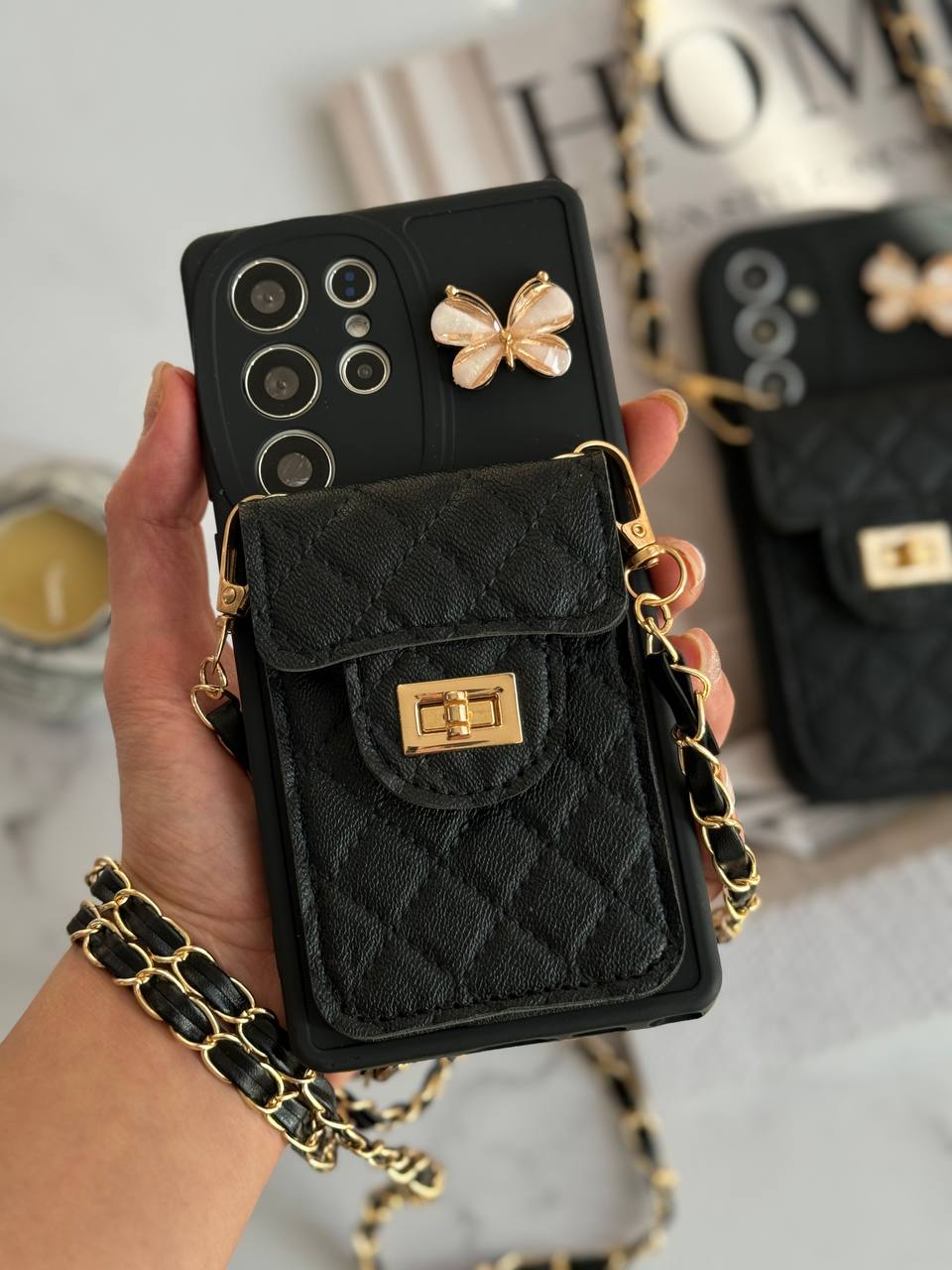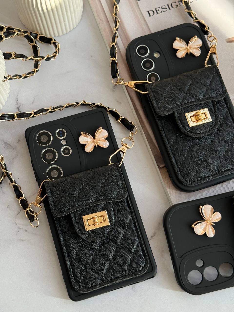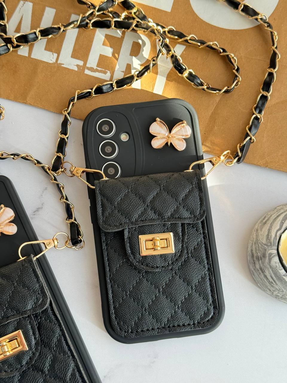 قاب موبایل سامسونگ مشکی بند زنجیری بلند بالشتی پروانه ای جاکارتی دار