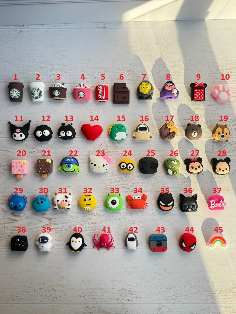 31-گاو ,11-کرومی ,12-هپل ساده ,13-هپل شاخ دار ,14-قلب ,15-بچه دایناسور ,16-کوسه هودی دار ,17-خرس بیسکویتی ,18-خرس قهوه ای ,19-سنجاب ,2-استارباکس لیوانی سفید ,20-بستنی چوبی صورتی ,21-بستنی چوبی قهوه ای ,22-مایک کلاه دار ,23-هلوکیتی ,24-مینیون دو چشم ,25-اسکلت ,26-دایناسور برقی ,27- چهره مینی موس ,28- چهره میکی موس ,29-استیچ ,3-فراپاچینو قهوه ,30-سالیوان ,32-ام اند ام ,33-بچه مایک تک چشم ,34-خرچنگ ,35-بتمن ,36- گربه چشم تیله ,37-باربی ,38-دسته ایکس باکس ,39-فضانورد ,4-فراپاچینو توت ,40-پنگوئن ,41-هشت پا ,42-کوسه طوسی ,43-نینتندو ,44-اسپایدرمن ,45-ابر رنگین کمان ,5- کوکاکولا ,6-شکلات ,7-باب گنگ ,8-پاتریک گنک ,9-مینی موس خال خالی ,1-استارباکس لیوانی قهوه ای ,10-پنجه صورتی |
