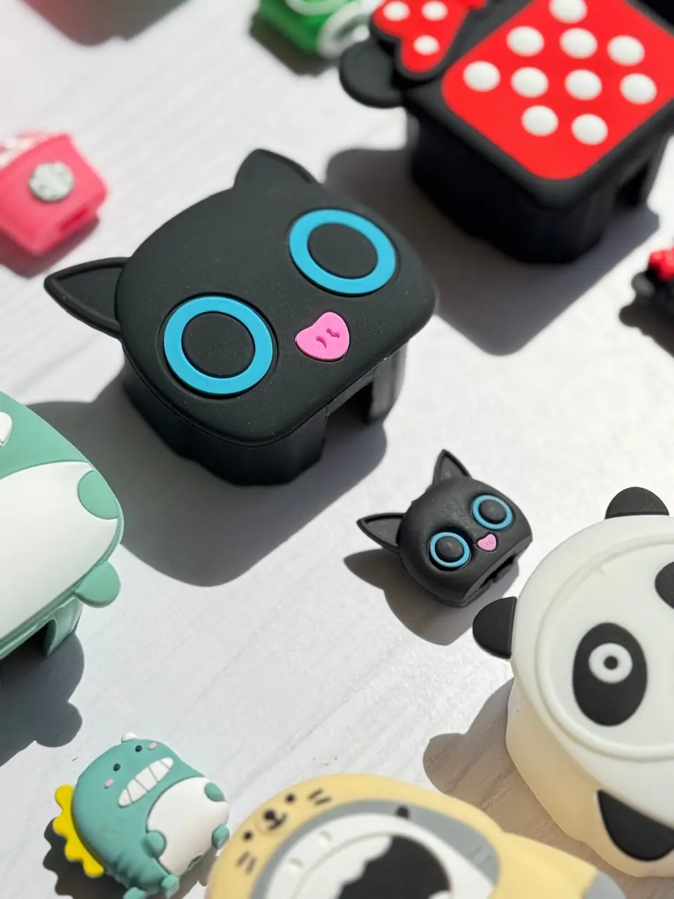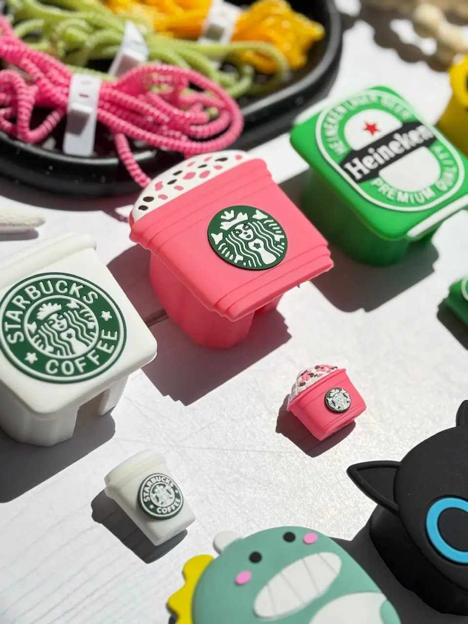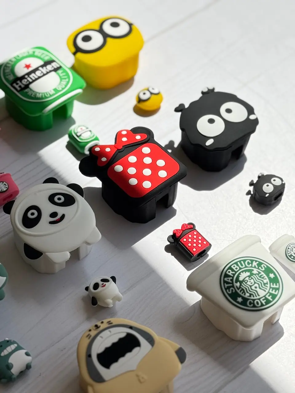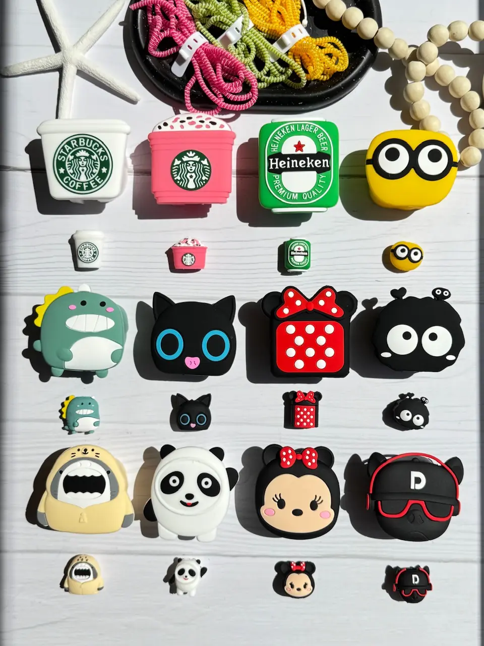 4-مینیون ,7- مینی موس خال خالی ,9- کوسه ,8-هپل شاخ دار ,1-استارباکس سفید ,10-پاندا ,11-مینی موس صورت ,12-بول داگ ,2-استارباکس صورتی ,3-هانیکن ,5-بچه دایناسور ,6-گربه چشم تیله ای |